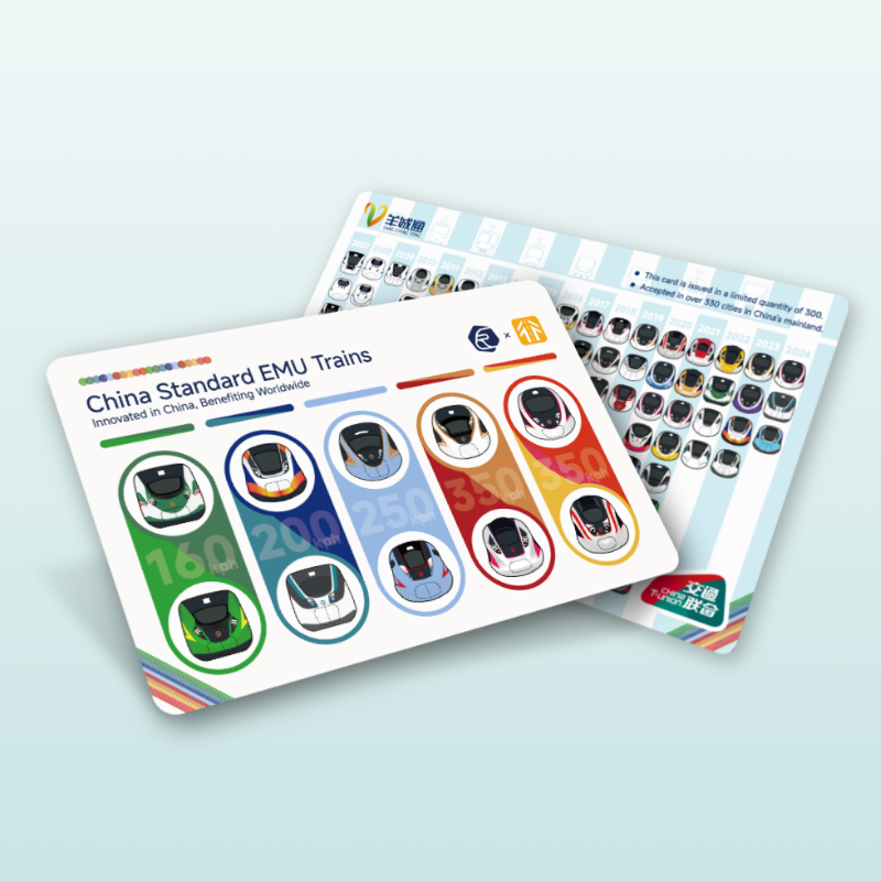 The face of the card features representative models of China Standard EMUs from different speed classes, each with its unique livery. Through the personified design of "EMU-mojis," the card showcases the diversity in speed and performance of these models. The background is adorned with the colors of the train liveries, reflecting the vibrant development and proud technological achievements of China's high-speed rail.